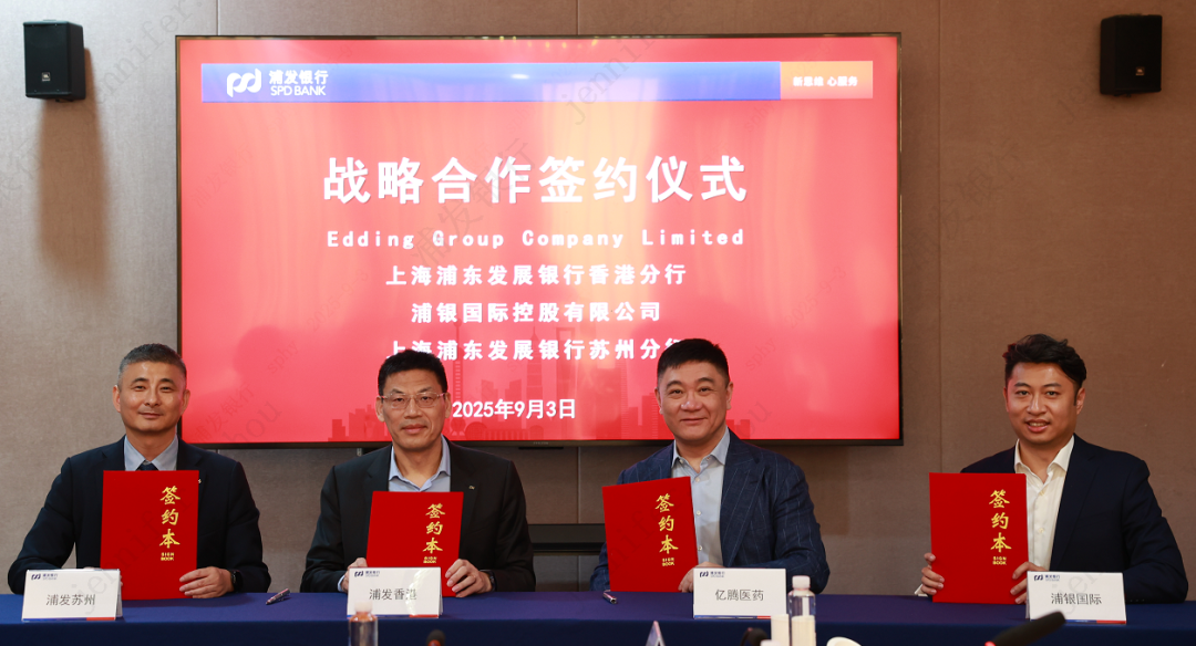 2025年9月3日下午,亿腾医药、浦发银行香港分行、浦发银行苏州分行以及浦银国际在苏州分行签约四方签署战略合作协议。